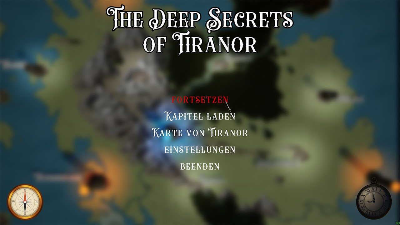 Menu 0.5: Hauptmenü bei [ESC] mit Fortsetzen, Kapitel (Map) wählen, Einstellungen (nur zu 1% fertig) und Spiel Beenden. Im Hauptmenü wird nun auch die aktuelle Tageszeit dargestellt.