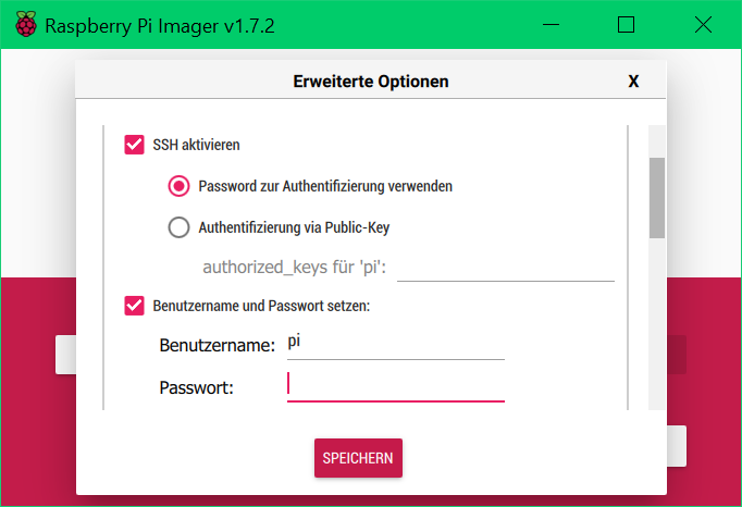 4. SSH aktivieren & Benutzername und Password setzen aktivieren. Benutzer und Passwort festlegen.